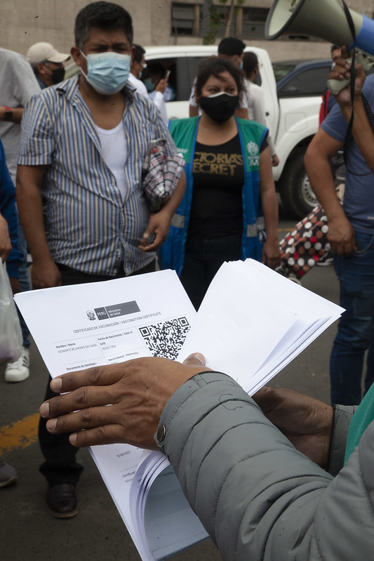 Esta semana la comuna limeña ha implementado cinco módulos para que los vecinos y comerciantes obtengan, de manera gratuita, su certificado de vacunación con el código QR impreso. Además, aquellos que no se hayan vacunado podrán hacerlo en el módulo de Sisol Salud instalado en el cruce de los jirones Ayacucho y Cusco, en el Cercado.