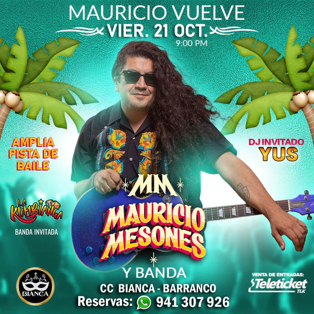 Usted no puede perder este gran concierto “Mauricio Mesones Vuelve” con Dj Invitado Yus, que se realizará el próximo viernes 21 de octubre a las 9 de la noche en el Centro de Convenciones Bianca (Av. Grau, 135, Barranco). Informes y reservas al 941 307 926. Entradas a la venta en Teleticket de Wong y Metro.