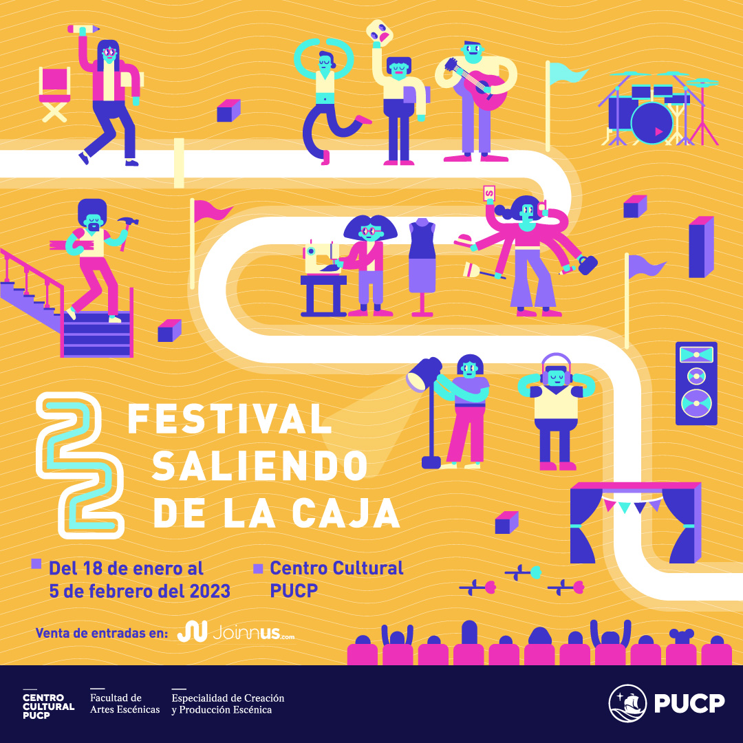 La Pontificia Universidad Católica del Perú presenta el 22º Festival “Saliendo de la Caja”, evento organizado por los estudiantes de la especialidad de Creación y Producción Escénica en conjunto con la Facultad de Artes Escénicas y el Centro Cultural PUCP. Las actividades se realizarán del miércoles 18 de enero al domingo 5 de febrero, como parte de una programación totalmente presencial que fortalezca los vínculos con el público y visibilice el exigente trabajo que realizan los artistas emergentes para crear una pieza artística.