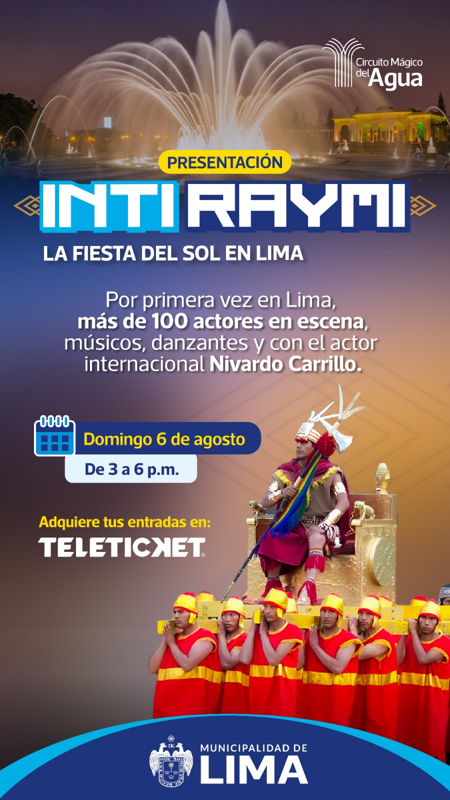 La Fiesta del Inti Raymi se realizará el domingo 6 de agosto a partir de las 3 de la tarde, en el Circuito Mágico del Agua, con la actuación estelar de Nivardo Carrillo, destacado actor Inca, que presidió la ceremonia del Inti Raymi, durante años y compartió escenario con actores internacionales como Gloria Stefan.