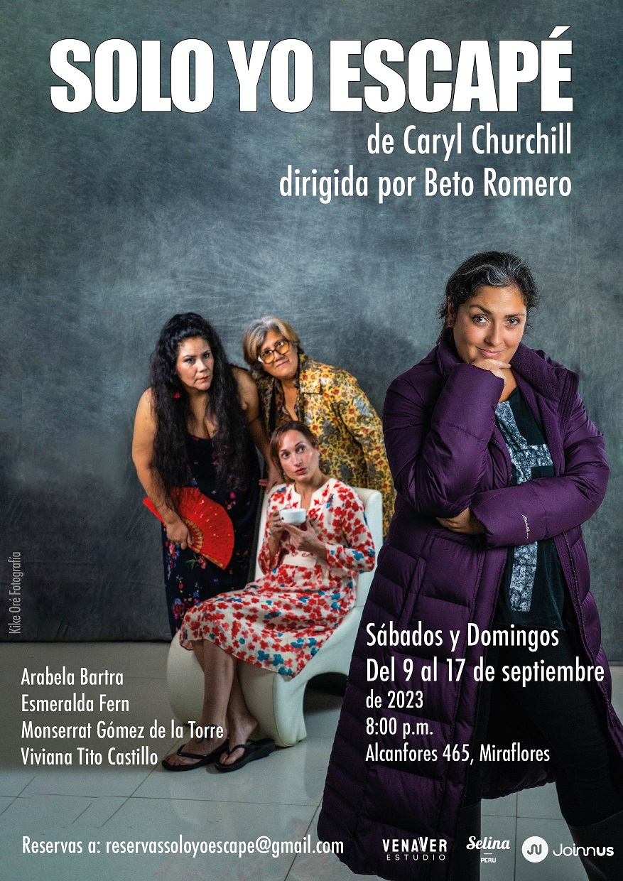 El sábado, 9 de septiembre, se estrena por primera vez en el Perú la puesta en escena de “Solo yo escapé”, escrita por la dramaturga británica Caryl Churchill, bajo la dirección de Beto Romero, con las actuaciones de Arabela Bartra, Esmeralda Fern, Monserrat Gómez De La Torre y Viviana Tito Castillo.
