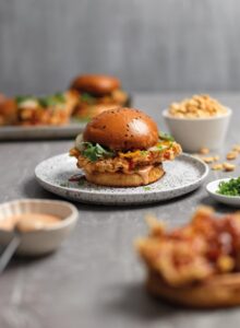- Para servir, cortar cada brioche y untarlo con la golf picante. Colocar el pollo frito, y cubrirlo con la Billy Jack, los pickles, el ají amarillo encurtido, la cebolla china, las ramas de culantro y finalmente, el maní triturado. Asimismo, se recomienda untar más golf picante en la tapa para realzar el sabor del sándwich.
