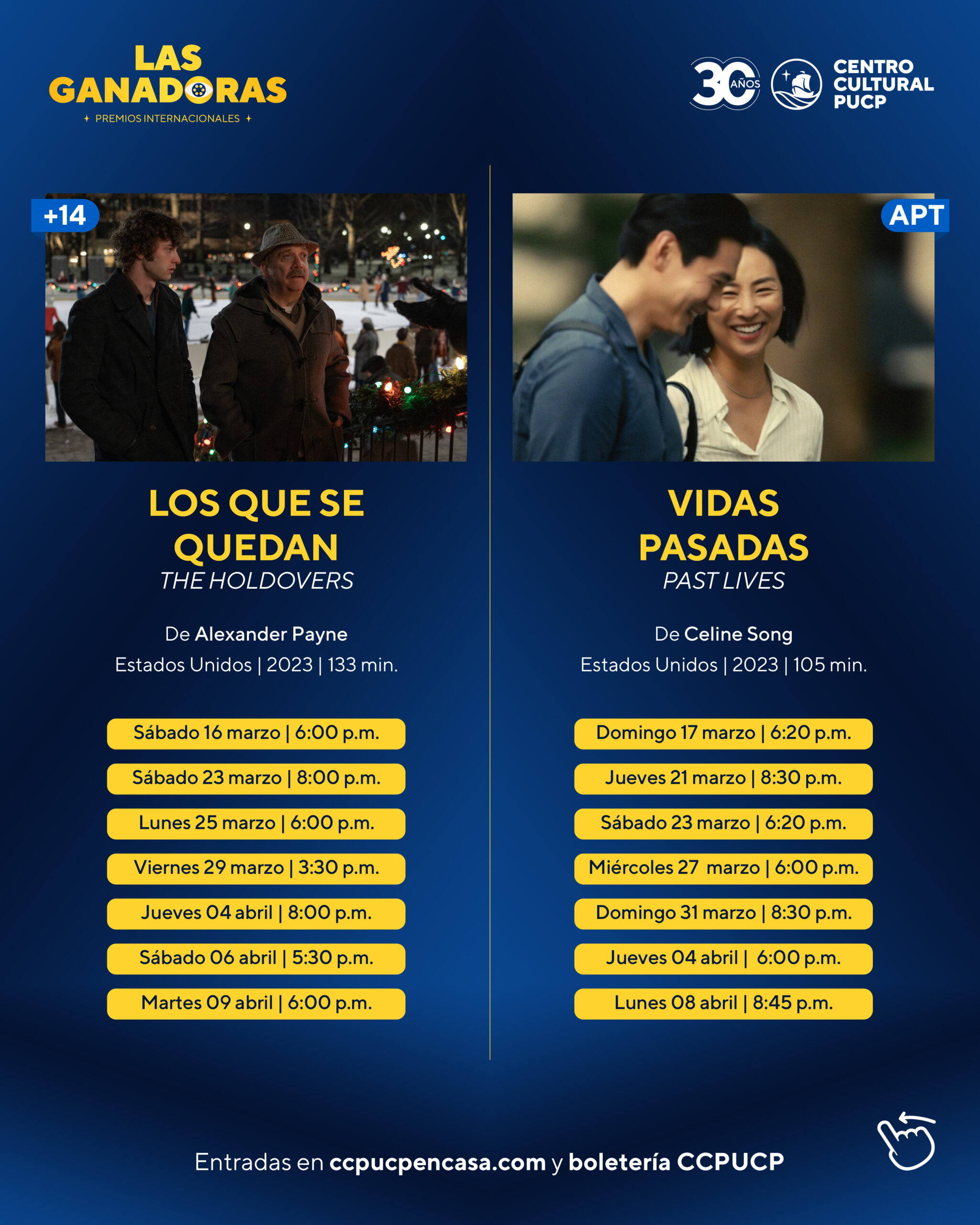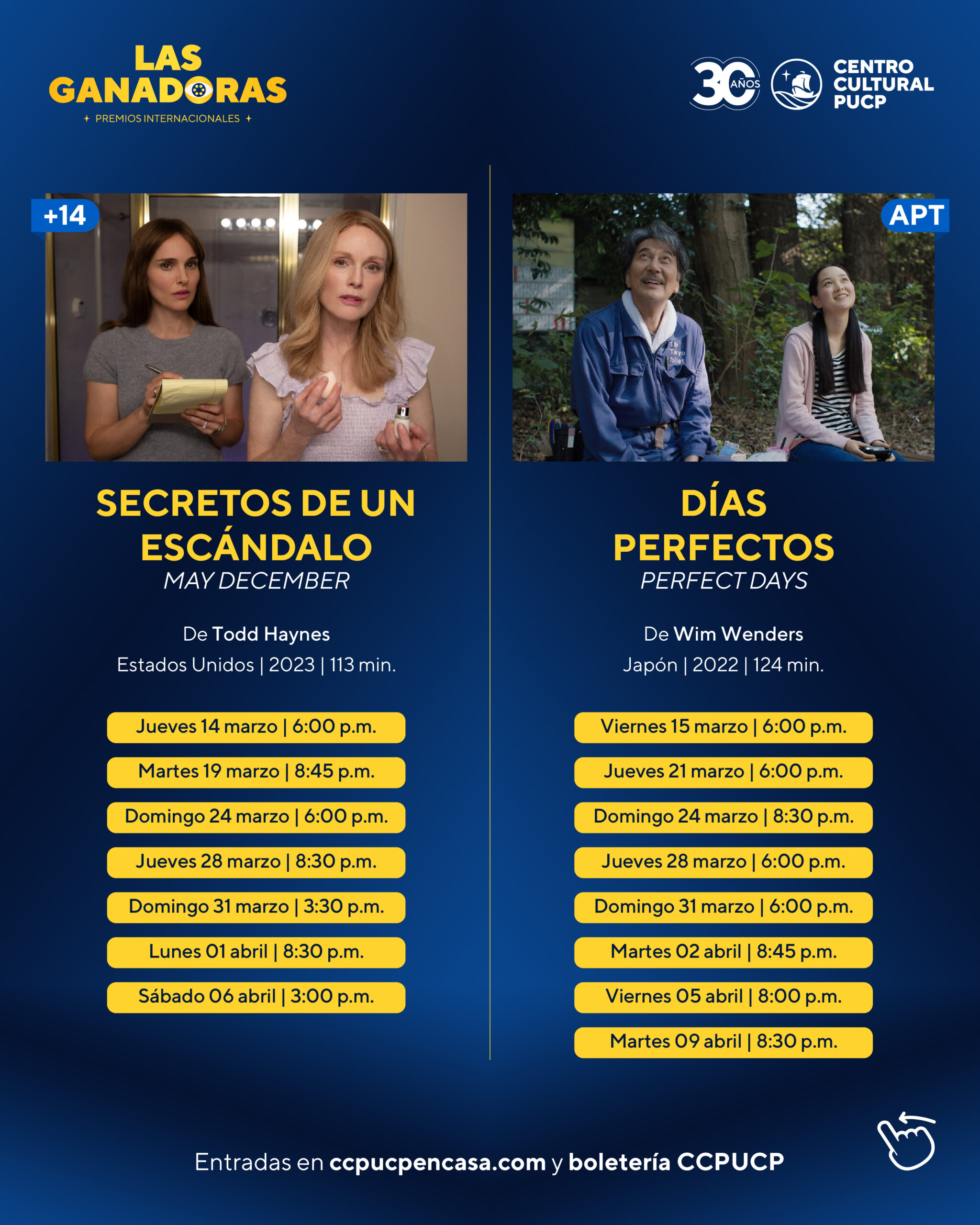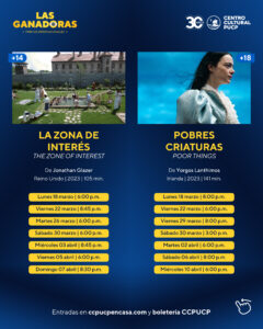 El Centro Cultural de la Pontificia Universidad Católica del Perú, se complace en presentar el ciclo de cine “Las ganadoras 2024”. Programación que cuenta con una selección de 10 películas ganadoras de premios cinematográficos internacionales, como los Premios Oscar, Golden Globes, SAG Awards, BAFTA, Critics Choice Awards, Independent Spirit Award y Goya, que incluye títulos de diferentes países como Estados Unidos, Francia, Reino Unido, Irlanda, Japón, Italia y España. Las entradas ya están a la venta en ccpucpencasa.com y en la boletería del CCPUCP de lunes a domingo de 2:30 a 8:30 p.m.