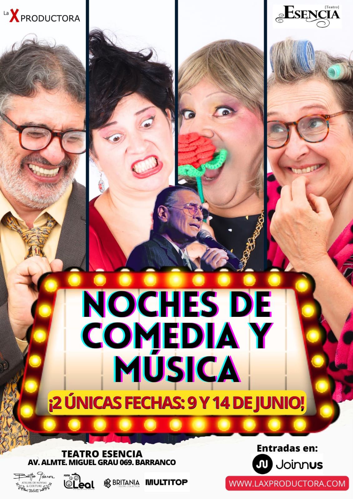 La X Productora se complace en anunciar “Noches de Comedia y Música”, un evento imperdible que combinará risas y melodías en un solo escenario. Con solo dos fechas exclusivas, este espectáculo se presentará el domingo 9 de junio a las 7:00 pm y el viernes 14 de junio a las 8:30 pm en el Teatro Esencia, ubicado en Av. Almte. Miguel Grau 069, Barranco.