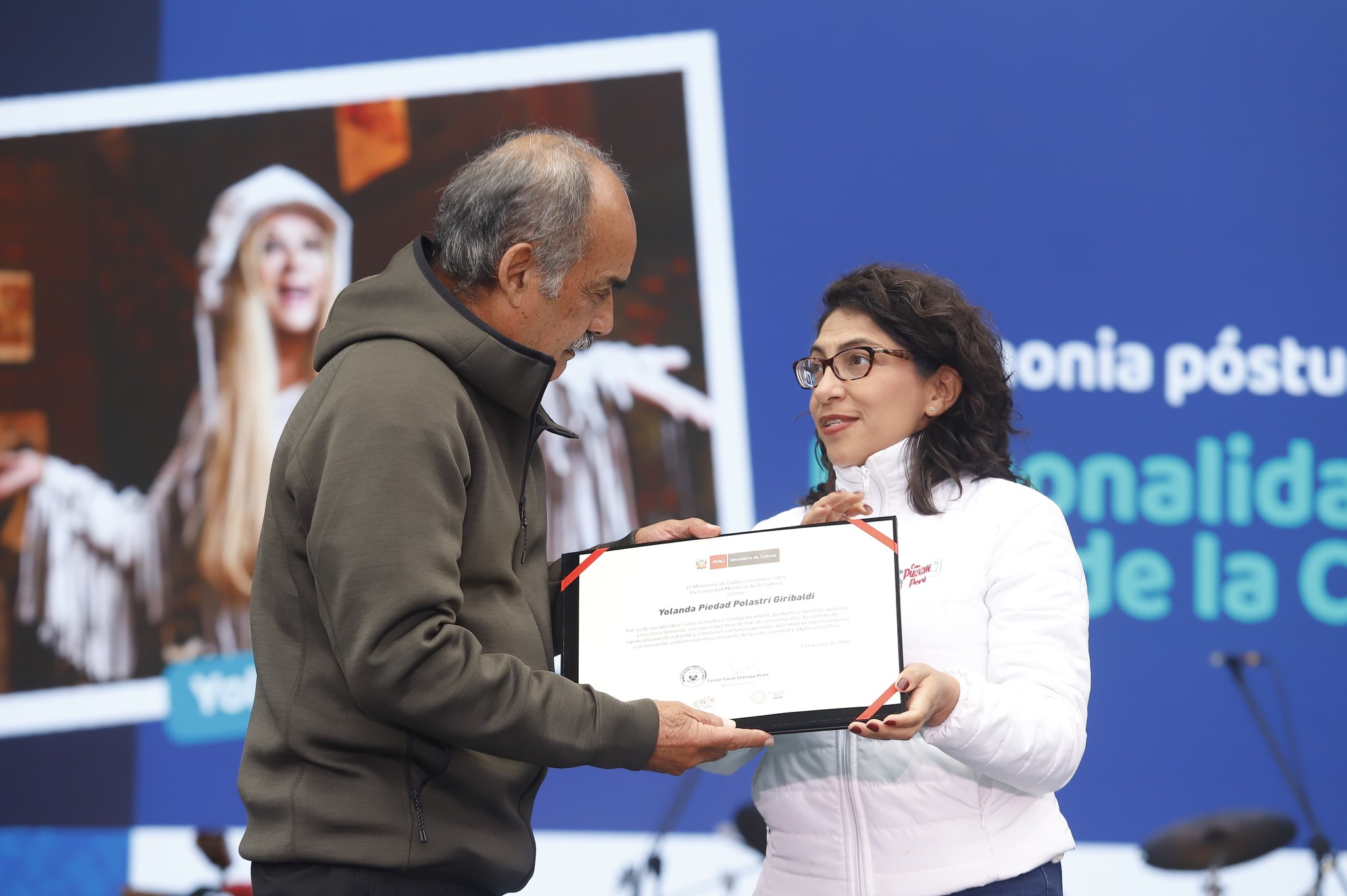La ministra de Cultura, Leslie Urteaga, otorgó ayer el reconocimiento póstumo de Personalidad Meritoria de la Cultura a la animadora de televisión Yola Polastri, quien falleció el pasado domingo 7 de julio. El reconocimiento fue recibido por la sobrina de la reconocida artista, Danitza Pavlich Polastri y el hermano, Augusto Polastri, durante el Festival Cultural “Una sola voz por el Perú” – Edición Bicentenario.