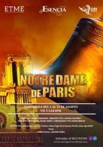 “Notre- Dame de París” es una adaptación del musical francés Notre- Dame de París con música de Riccardo Cocciante y libreto y letras de Luc Plamondon. Basado en la novela Nuestra Señora de París de Victor Hugo, su partitura incluye canciones como “Vivir”, “Belle”, entre otras que han alcanzado mucha popularidad y se han convertido en éxitos de ventas en el mercado francófono.