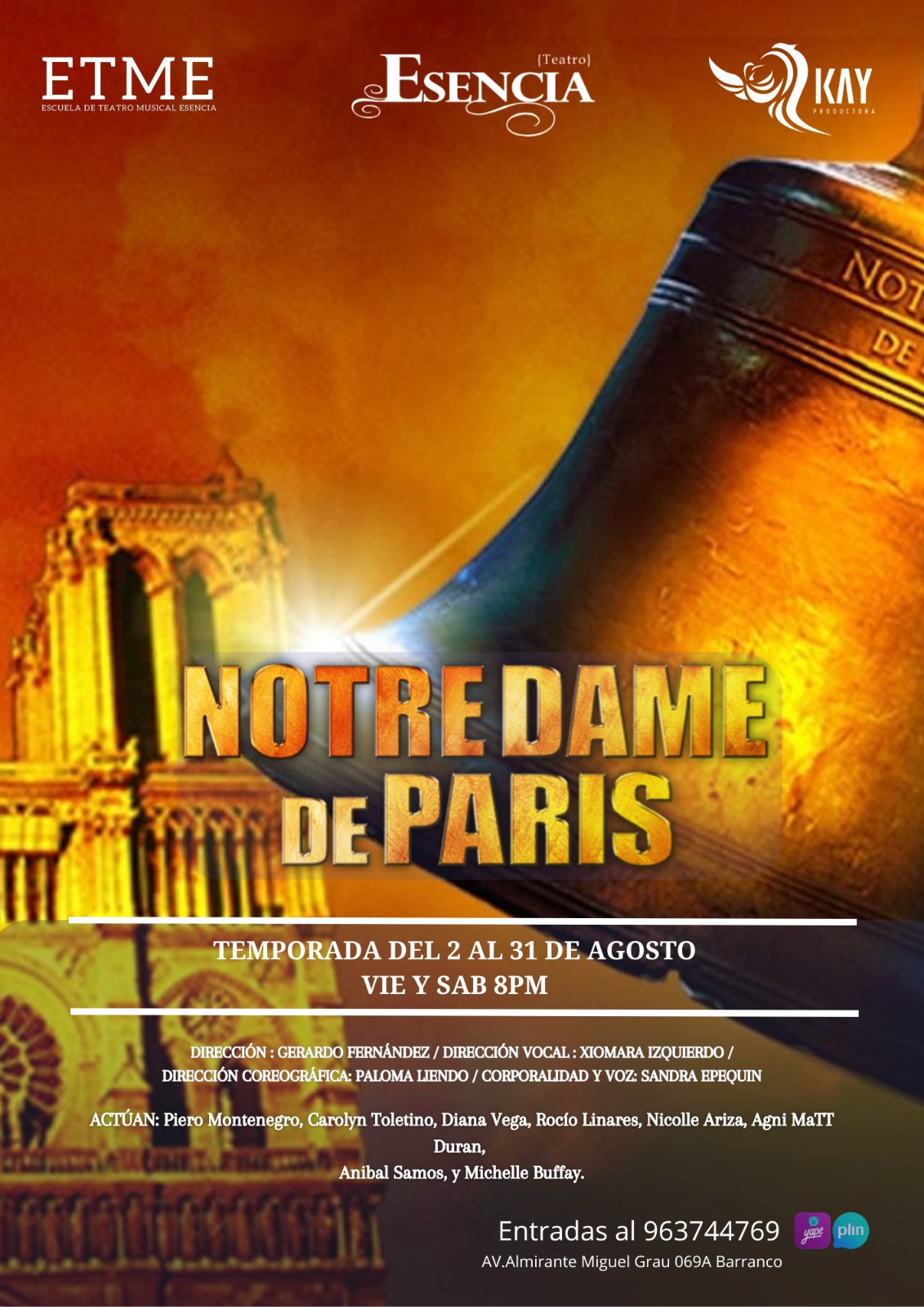 PRECIO DE ENTRADAS: Zona Valdemur: 37 soles (gradería con respaldo) Zona Ilegales: 35 soles (gradería sin respaldar) Zona Notre Dame: 47 soles (sillas). Venta de entradas: Yape, Plin al 963 744 769 , en el mismo teatro Esencia Almirante Miguel Grau 069A de Barranco