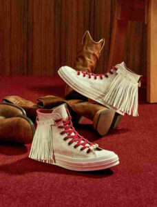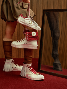 El modelo The Chuck 70 Tassel edition presenta un empeine de tejido satinado con borlas de cuero removibles, en una paleta de colores rojo y blanco, realzada por un aro en forma de D dorada con forma de herradura que aporta un encanto dinámico a la silueta clásica.
