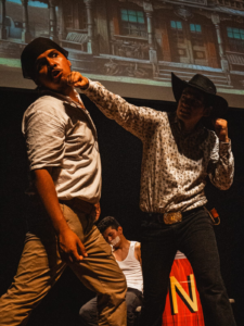 “Reticulatazo” es, ante todo, una obra de teatro físico y de lucha escénica: la narración avanza con el cuerpo, el ritmo y la coreografía de combate, construyendo un espectáculo ágil donde la acción es el lenguaje principal. La puesta toma códigos del western (duelos, vaqueros, peleas de bar) cruzándolos con humor popular y tono de caricatura para ofrecer una experiencia familiar, directa y muy disfrutable. Aunque la obra también opera como sátira sobre política y poder, su corazón está en la amistad y el compañerismo: el vínculo que sostiene al dúo cuando todo alrededor se vuelve más peligroso.