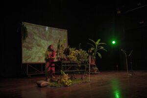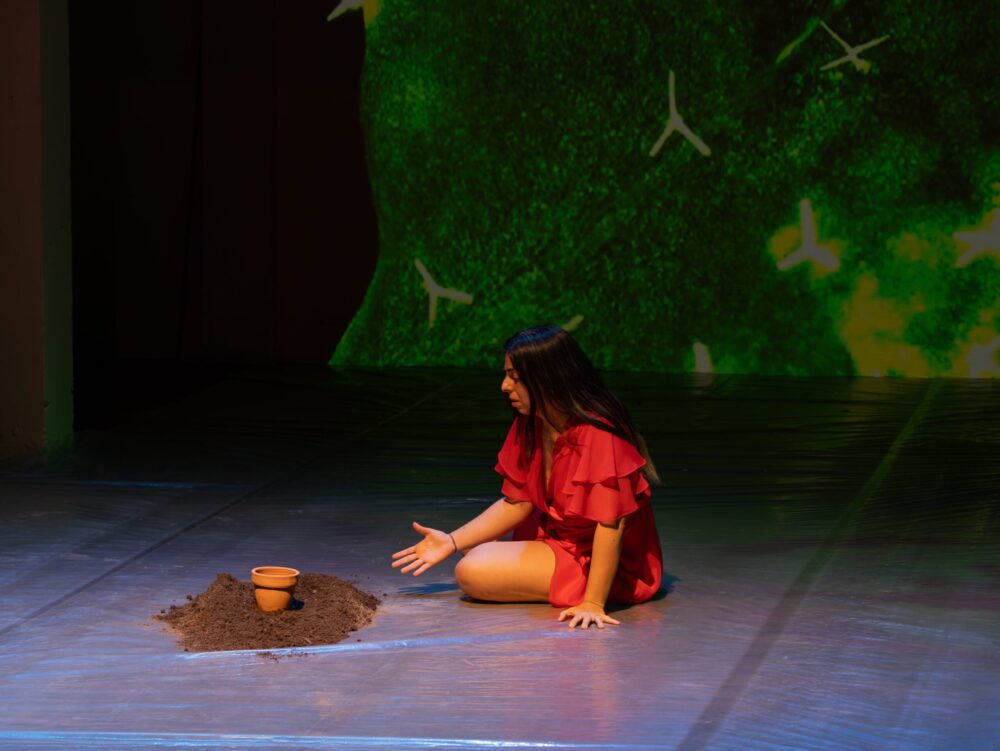 Las plantas cumplen un rol fundamental en escena: no son escenografía, son compañeras y también cocreadoras de la obra. “Algunas están desde el inicio, han ido atravesando todo el proceso conmigo. Estar junto a ellas es trabajar desde el afecto, la observación y el cuidado. Hay una relación muy concreta: tengo que cuidarlas, estar atenta a cómo están, porque también se afectan. Me interesa que en escena no estén como fondo, sino como presencia. Que se sienta que hay algo vivo ocurriendo ahí, en relación con el tiempo, con el cuerpo y con lo que está pasando en cada función”.